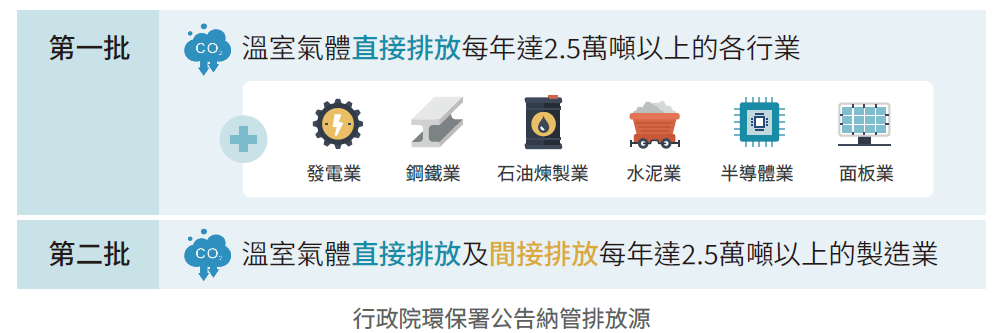 製造業部份,規劃「製程改善」、「能源轉換」、「循環經濟」三大面向,共十一項措施,推動產業從低碳邁向零碳,並由國營事業與領頭企業以身作則,及產業公協會與供應鏈中心廠引領,驅動中小企業合作減碳、建立減碳能力,逐步形成綠色供應鏈。