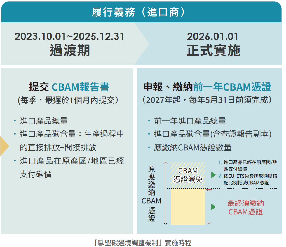 自2023年10月起,CBAM就會上路試行,在2023年10月至2025年底的試行過渡期間,企業須每季向歐盟會員國主管機關提交關於進口產品碳含量資訊的報告書,到2026年正式實施後,才會依企業申報的產品碳含量,來要求購買CBAM憑證。雖然CBAM目前管制的產業,並不是我國主要出口歐盟的項目,但考量未來歐盟可能擴大管制範疇,業者仍要有所準備。此外,美國、加拿大等國也在評估推動碳關稅,面對此國際趨勢,企業必須加快腳步啟動減碳、避免衝擊,以維持市場競爭力。