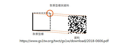 Data matrix 四周圍L型(如上圖取景型樣)和點線組成,只需對準任意方向皆可讀取資料。
